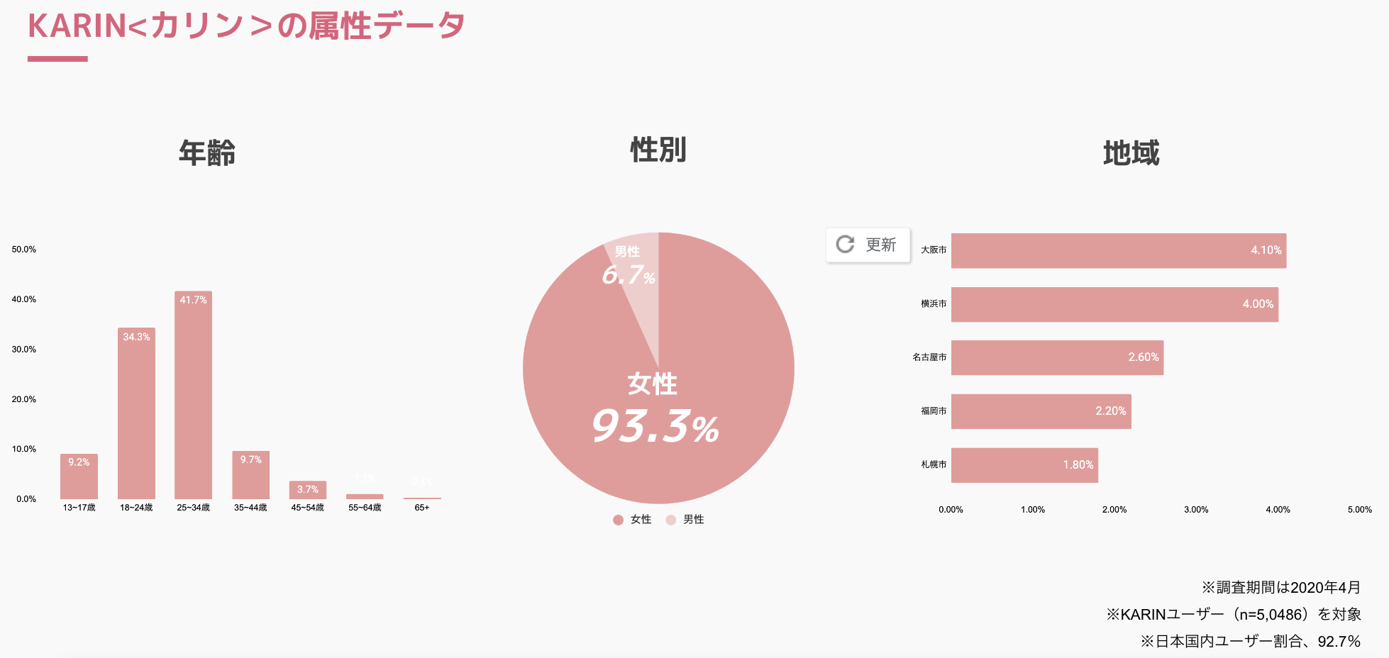@karin__lifeのユーザー層は、18〜34歳のF1層が75%以上を占めており、フォロワーの90%以上が女性です。